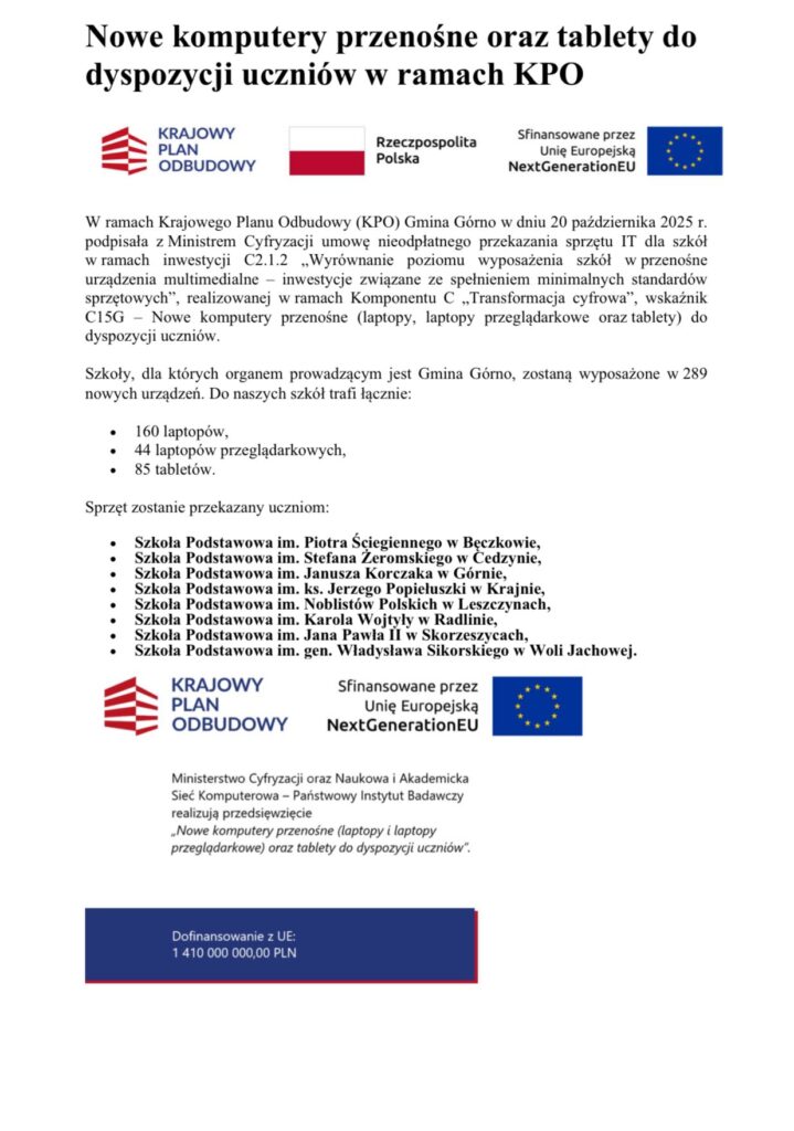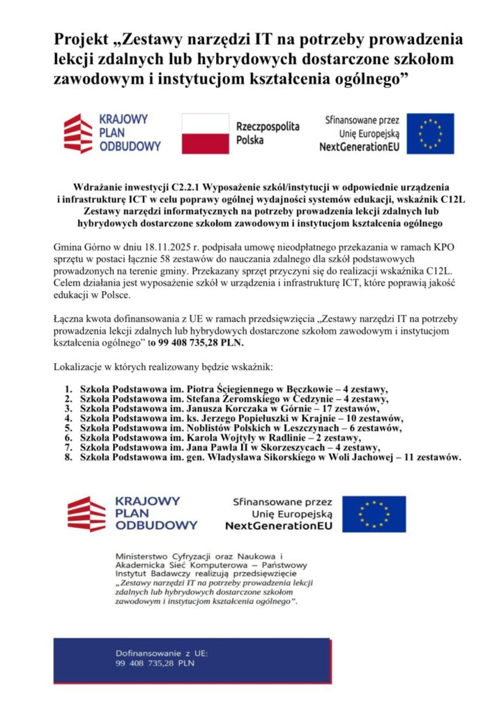 Gmina Gรณrno w dniu 18.11.2025 r. podpisaลa umowฤ nieodpลatnego przekazania w ramach KPO sprzฤtu w postaci ลฤ cznie 58 zestawรณw do nauczania zdalnego dla szkรณล podstawowych prowadzonych na terenie gminy. Przekazany sprzฤt przyczyni siฤ do realizacji wskaลบnika C12L. Celem dziaลania jest wyposaลผenie szkรณล w urzฤ dzenia i infrastrukturฤ ICT, ktรณre poprawiฤ jakoลฤ edukacji w Polsce.